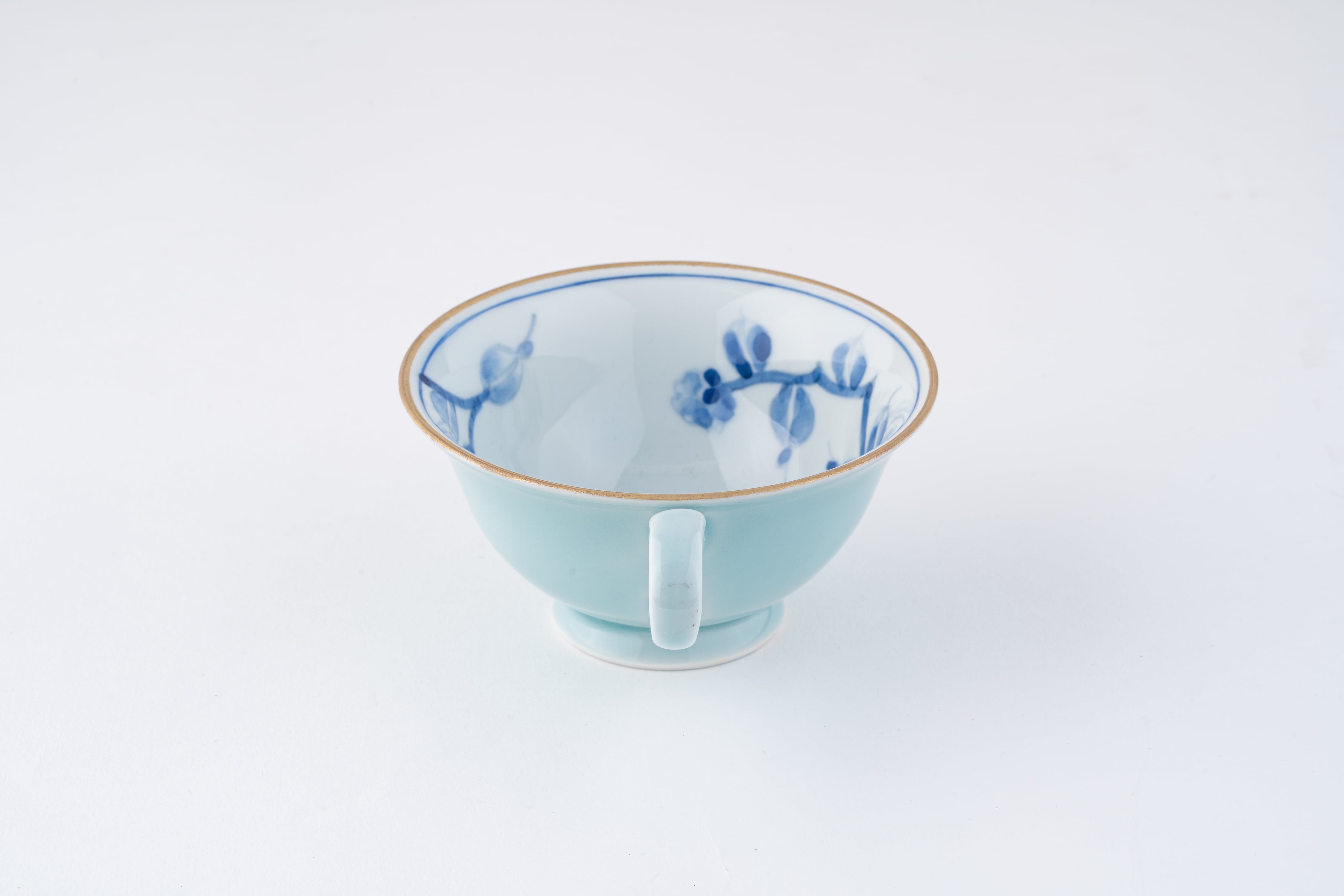 外側とソーサーは、艶やかで美しいペールブルー(淡い青)の単色使い。そしてカップを覗き込むと、内側(見込み)にだけ可憐な青い「カメリア(椿)」がひっそりと描かれています。カップとソーサーの縁には繊細な金彩が施されており、シンプルさの中にハッとするようなサプライズと高級感を秘めた素晴らしいデザインです。