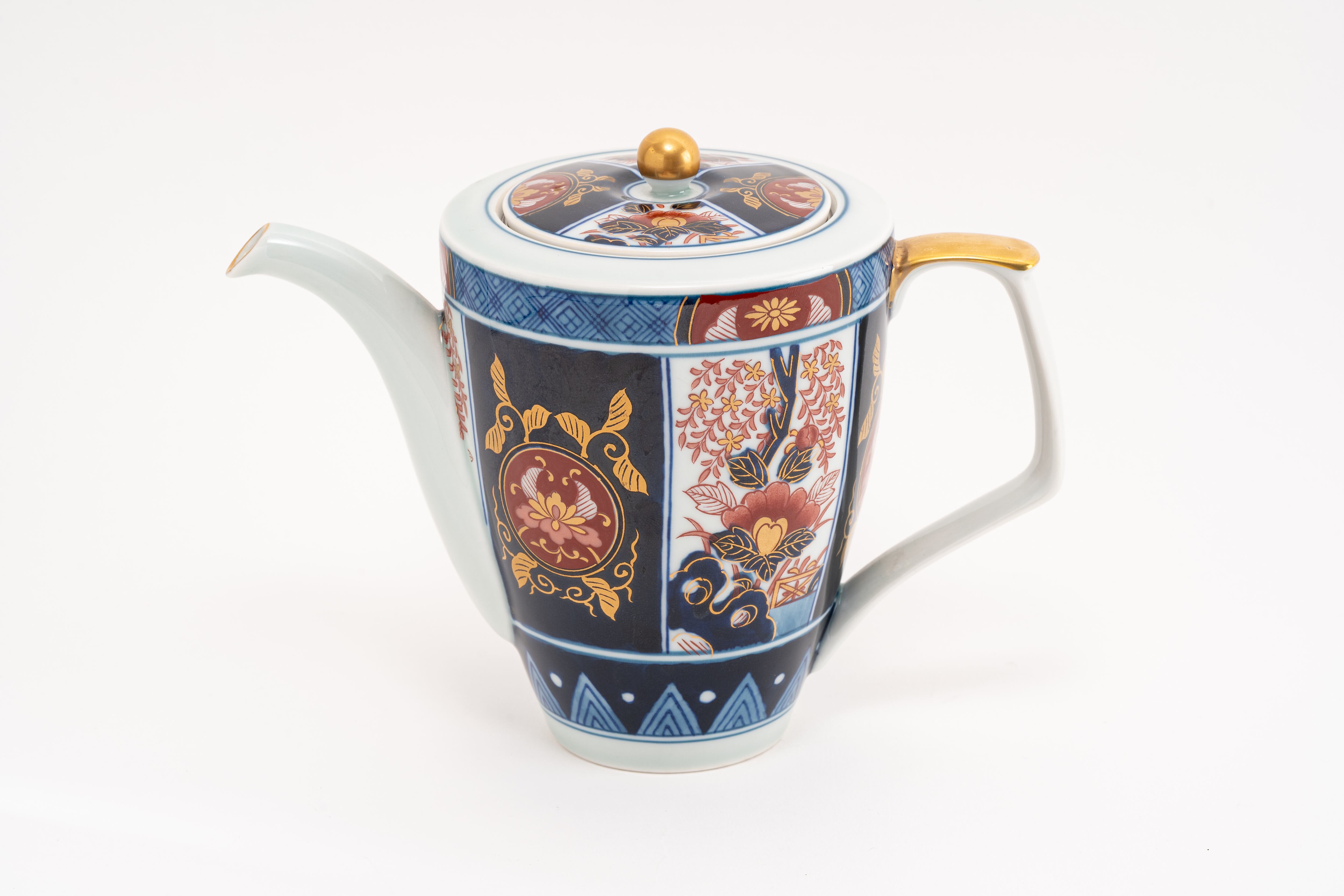 深い紺青と金彩が織りなす古伊万里文様を纏った、ギャラリー有田オリジナルの大サイズポットです。伝統的な染錦の技法で描かれた花鳥文と唐草が、格調高い趣を醸し出します。