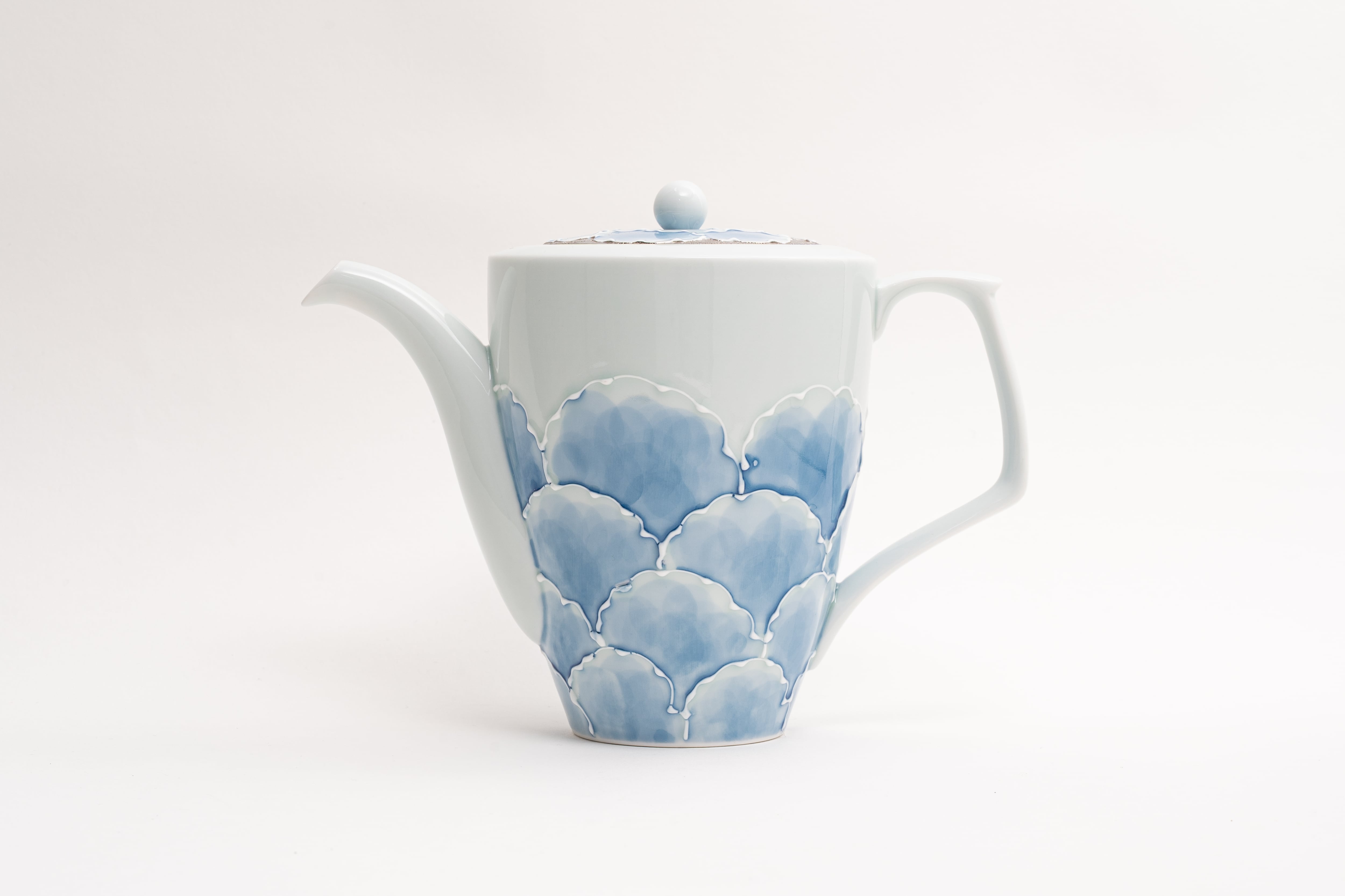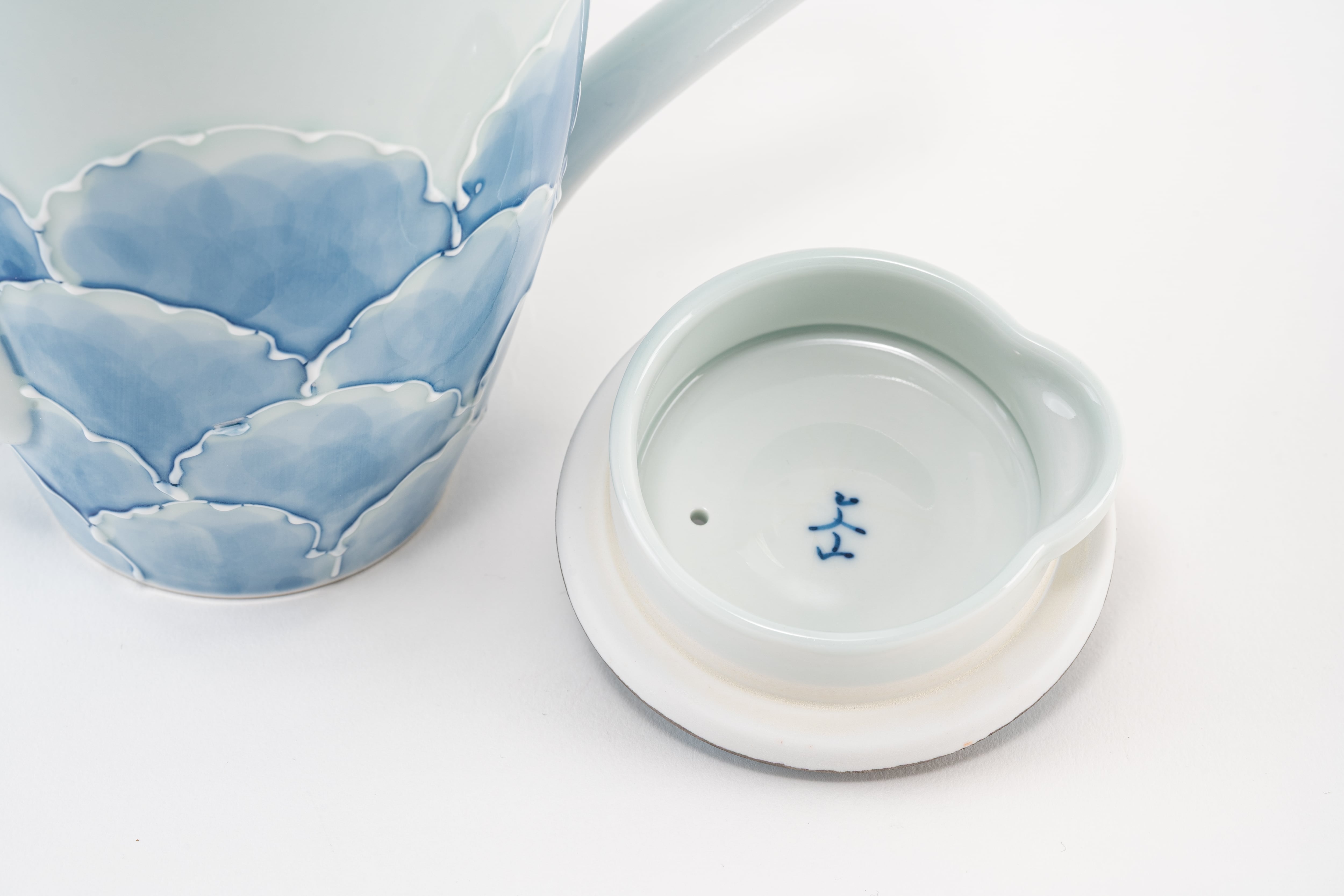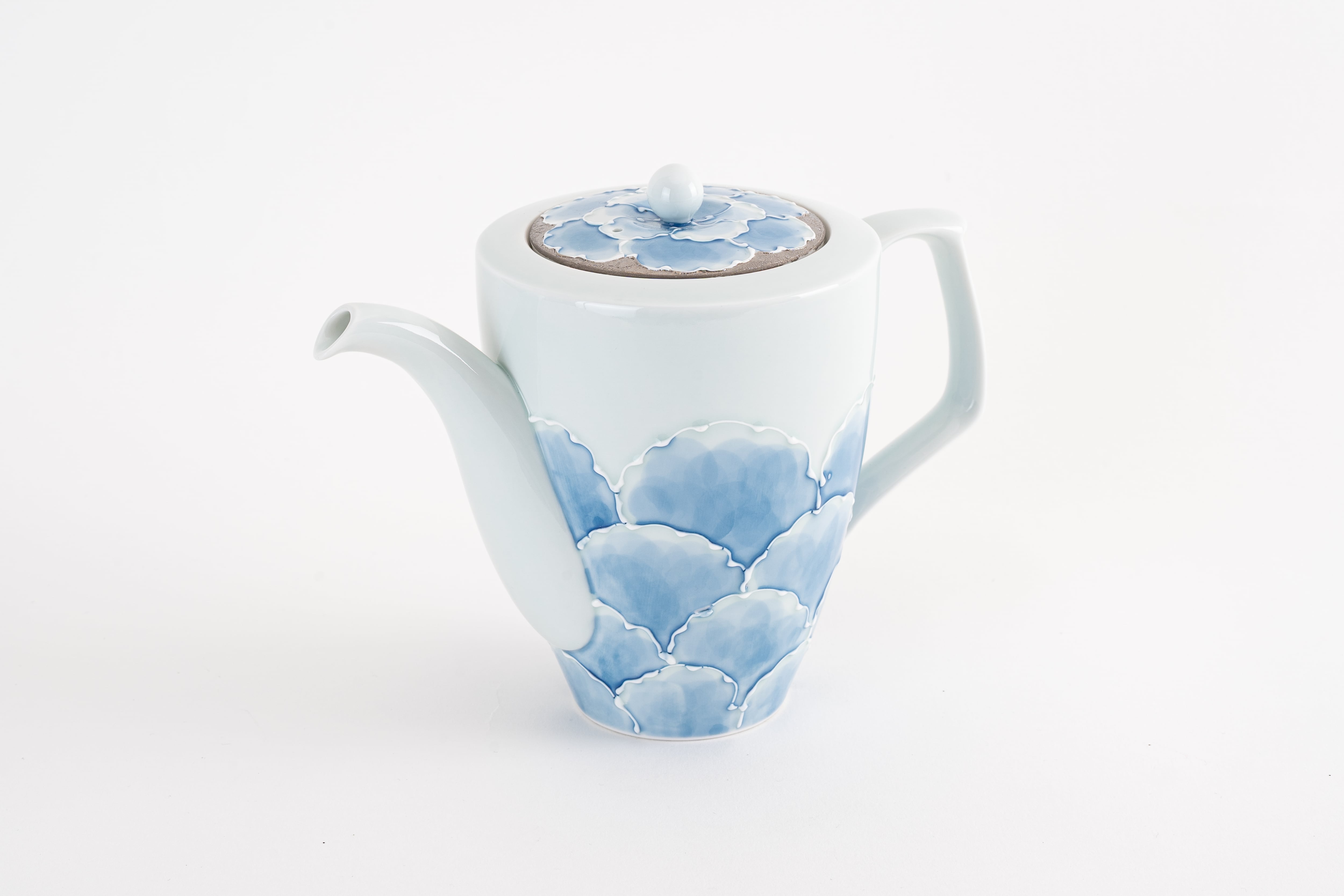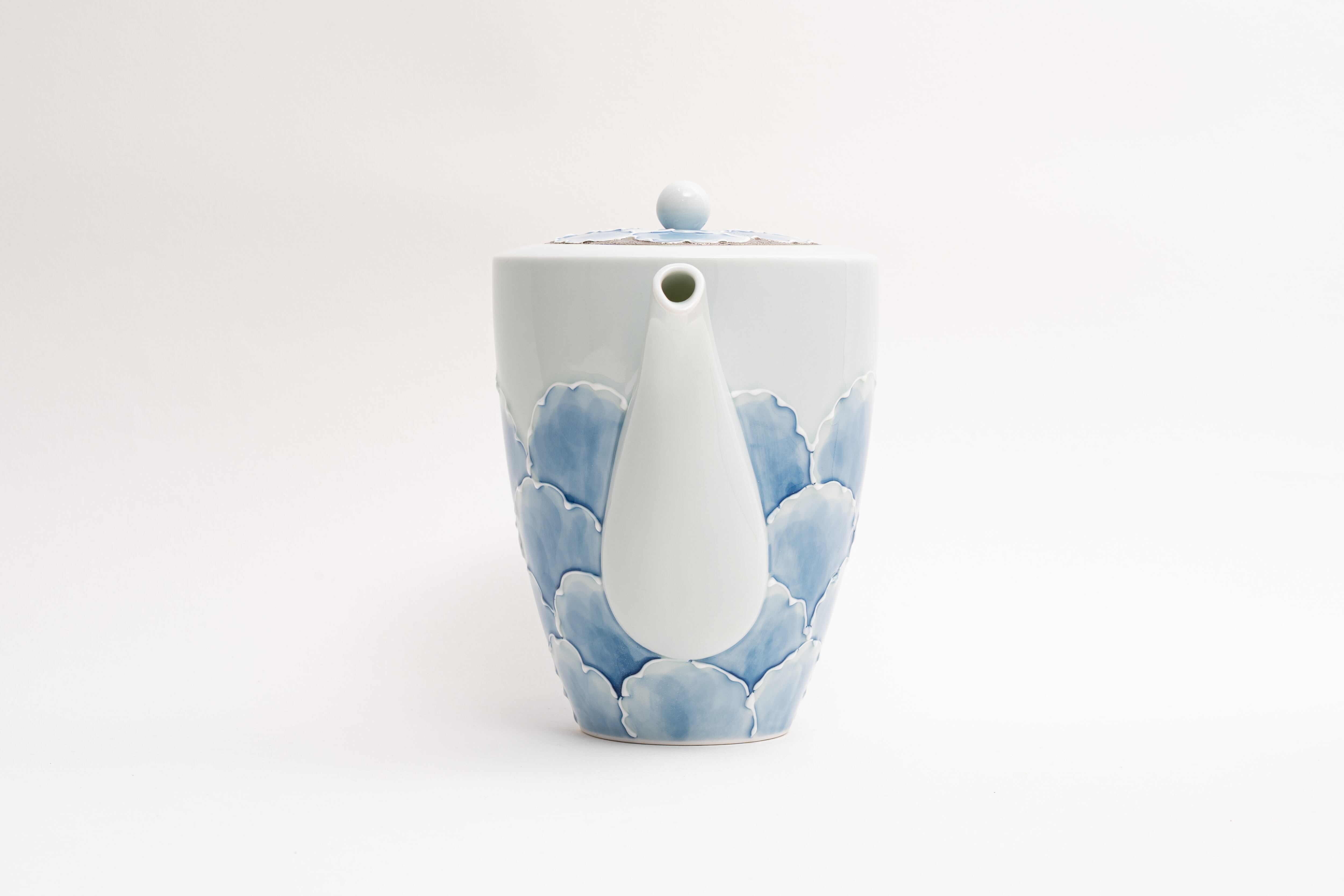 白磁の上に一珍技法で描かれた立体的な牡丹の花びらが印象的な、ギャラリー有田オリジナルの大サイズポットです。淡い藍色の牡丹と蓋に施されたプラチナのアクセントが、洗練されたモダンな印象を与えます。