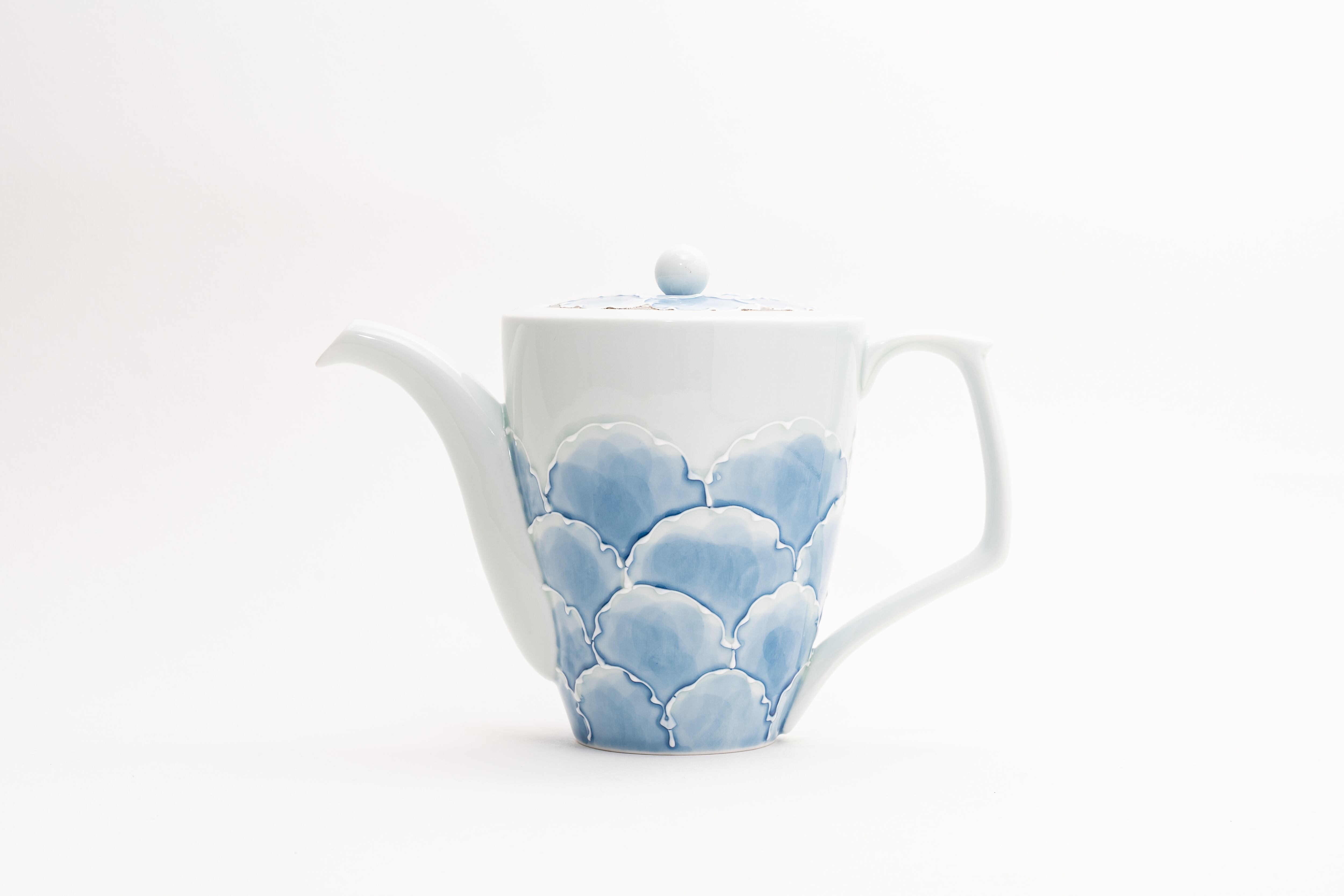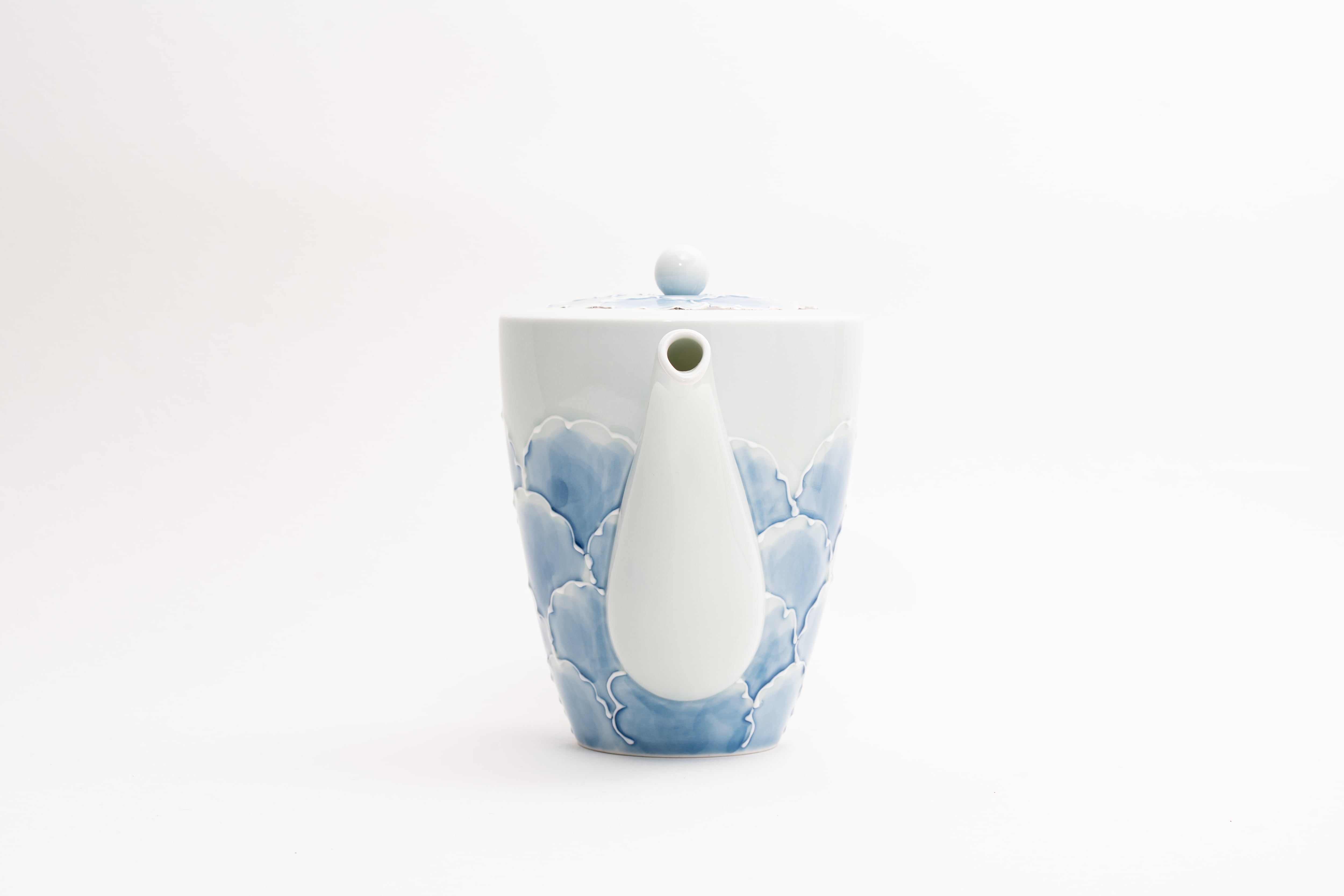 白磁の上に一珍技法で描かれた立体的な牡丹の花びらが印象的な、ギャラリー有田オリジナルの小サイズポットです。淡い藍色の牡丹と蓋のプラチナアクセントが、モダンで洗練された印象を与えます。1〜2人のティータイムにぴったりのサイズ感です。