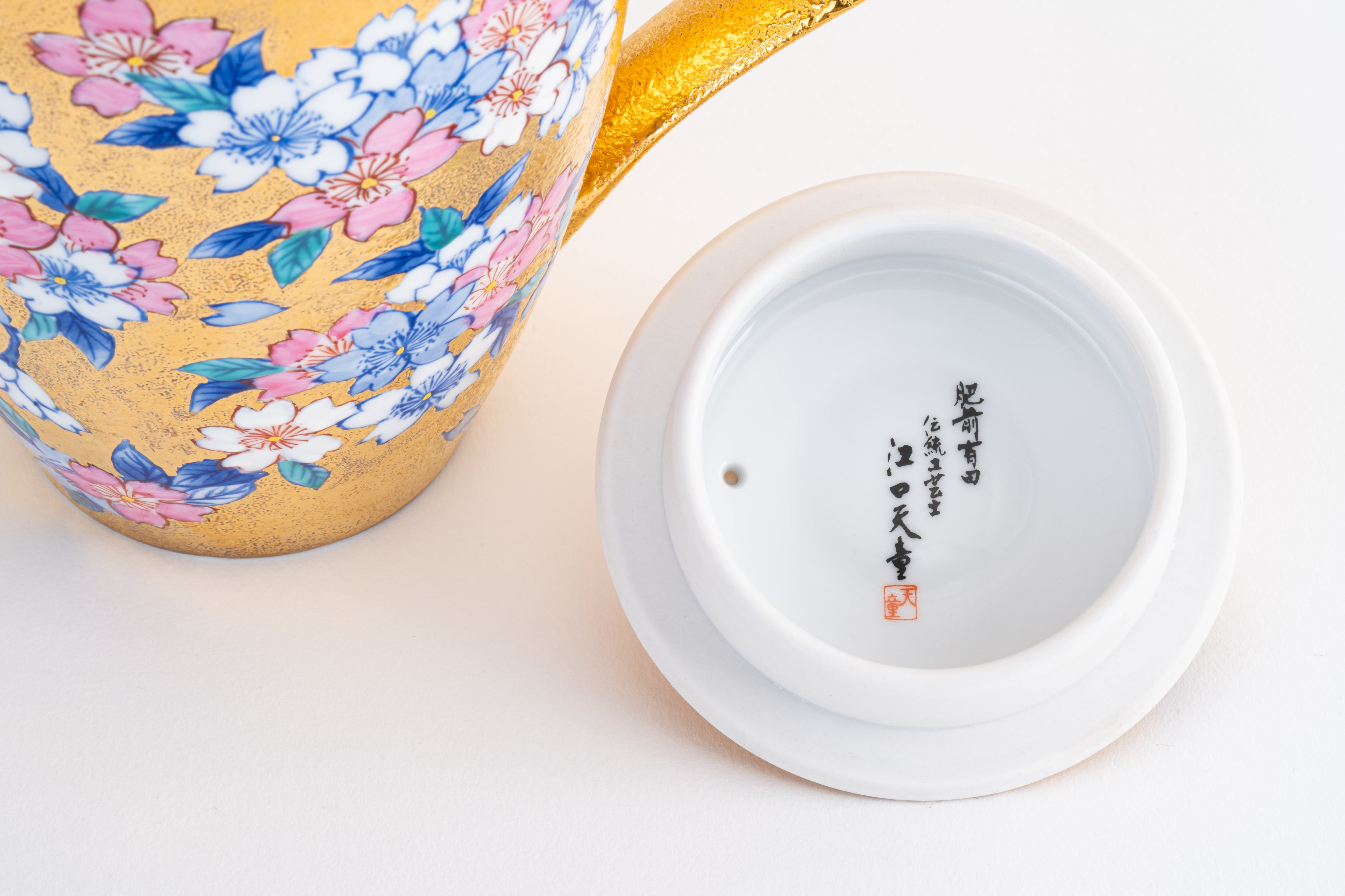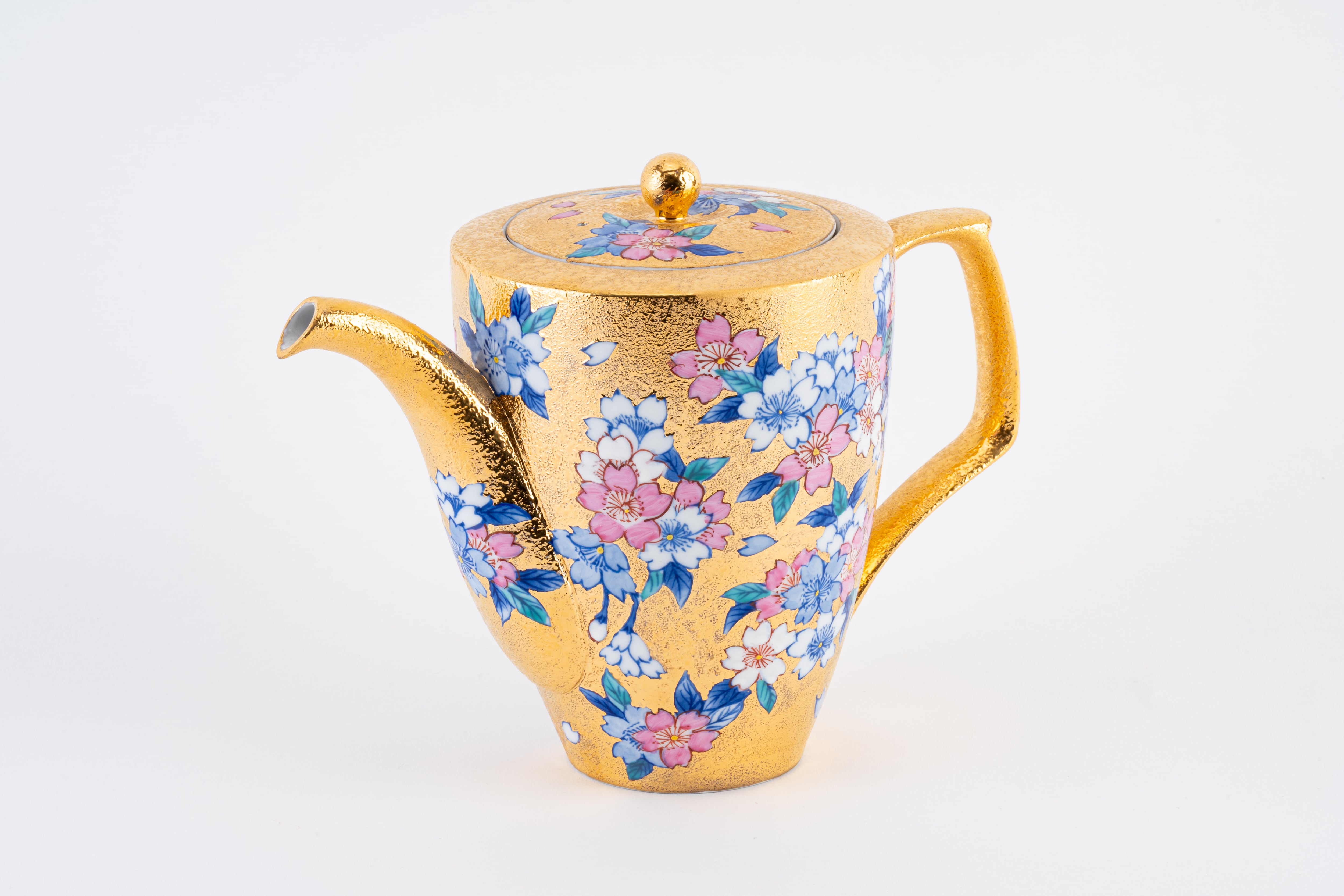 全面に金彩を施した上に、青・ピンク・白の桜を手描きで描いた、金龍窯の大サイズポットです。満開の桜が金地の上で華やかに咲き誇り、蓋にも桜をあしらった統一感のあるデザイン。日本を代表する花・桜と有田焼の最高峰の技が融合した逸品です。