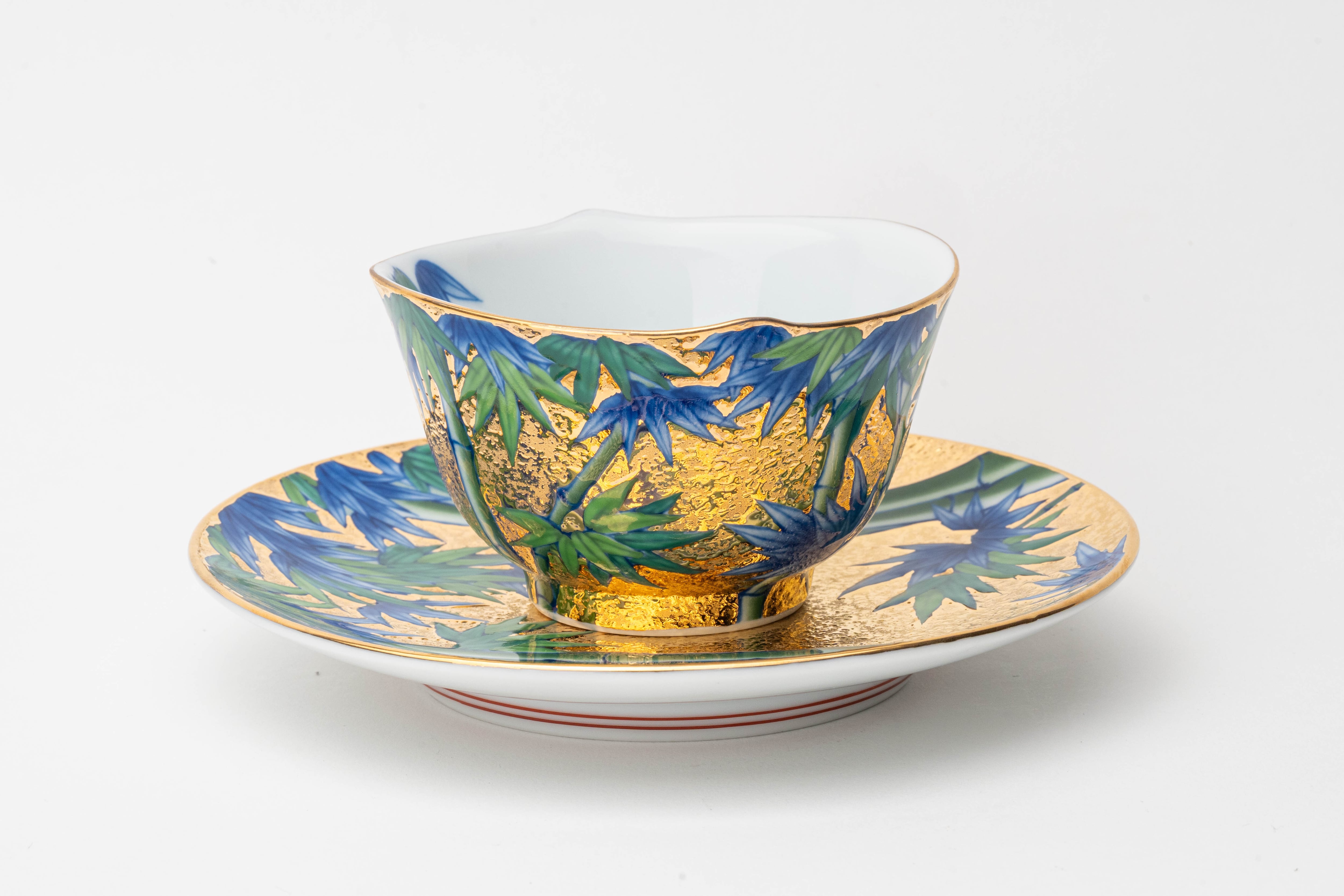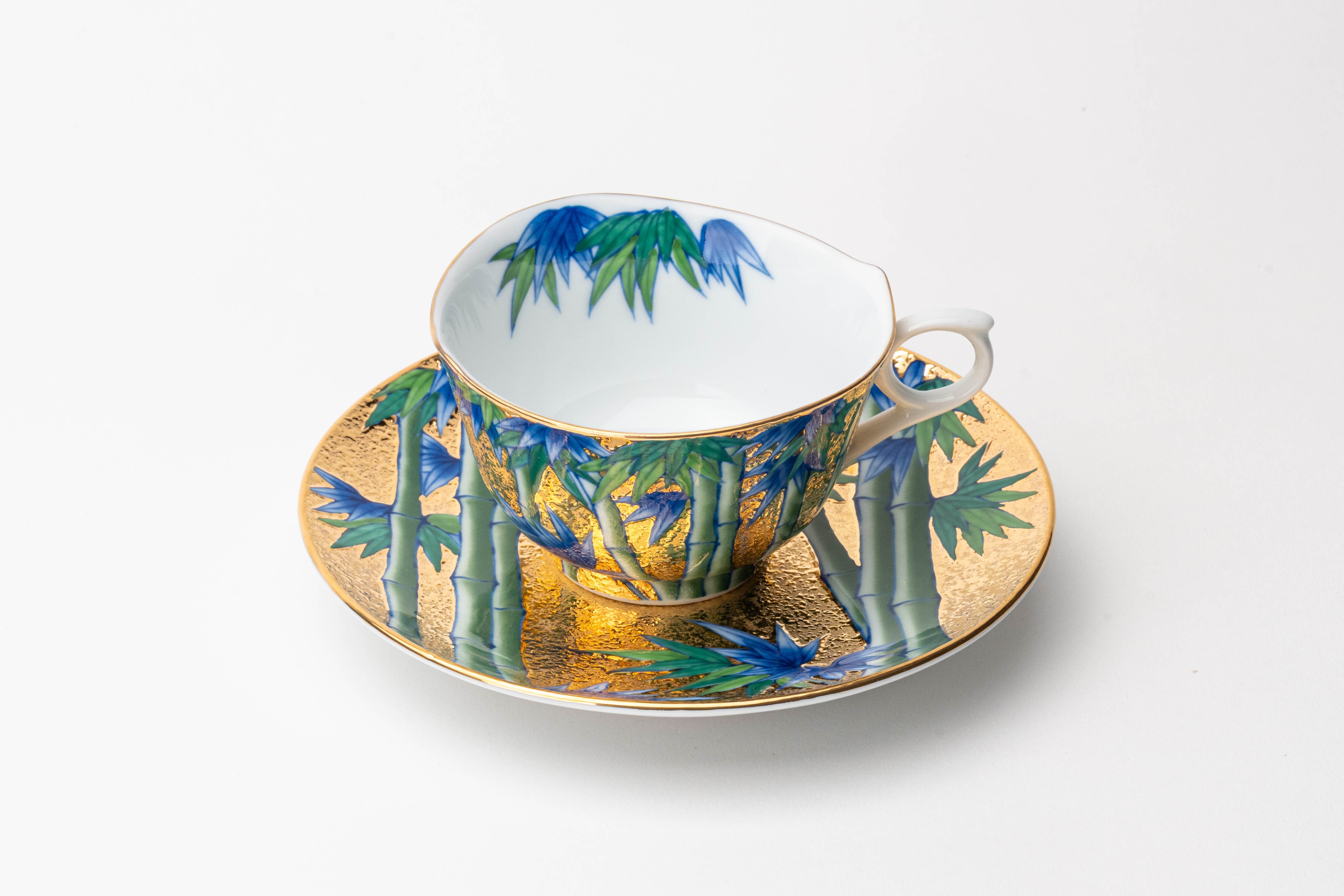 全面に金彩を施した上に、伝統工芸士・江口天童が一筆一筆手描きで竹林を描いた、金龍窯のコーヒーカップ&ソーサーです。鮮やかな青と緑の竹が金地の上でまっすぐに伸び、竹の生命力と凛とした美しさを表現しています。