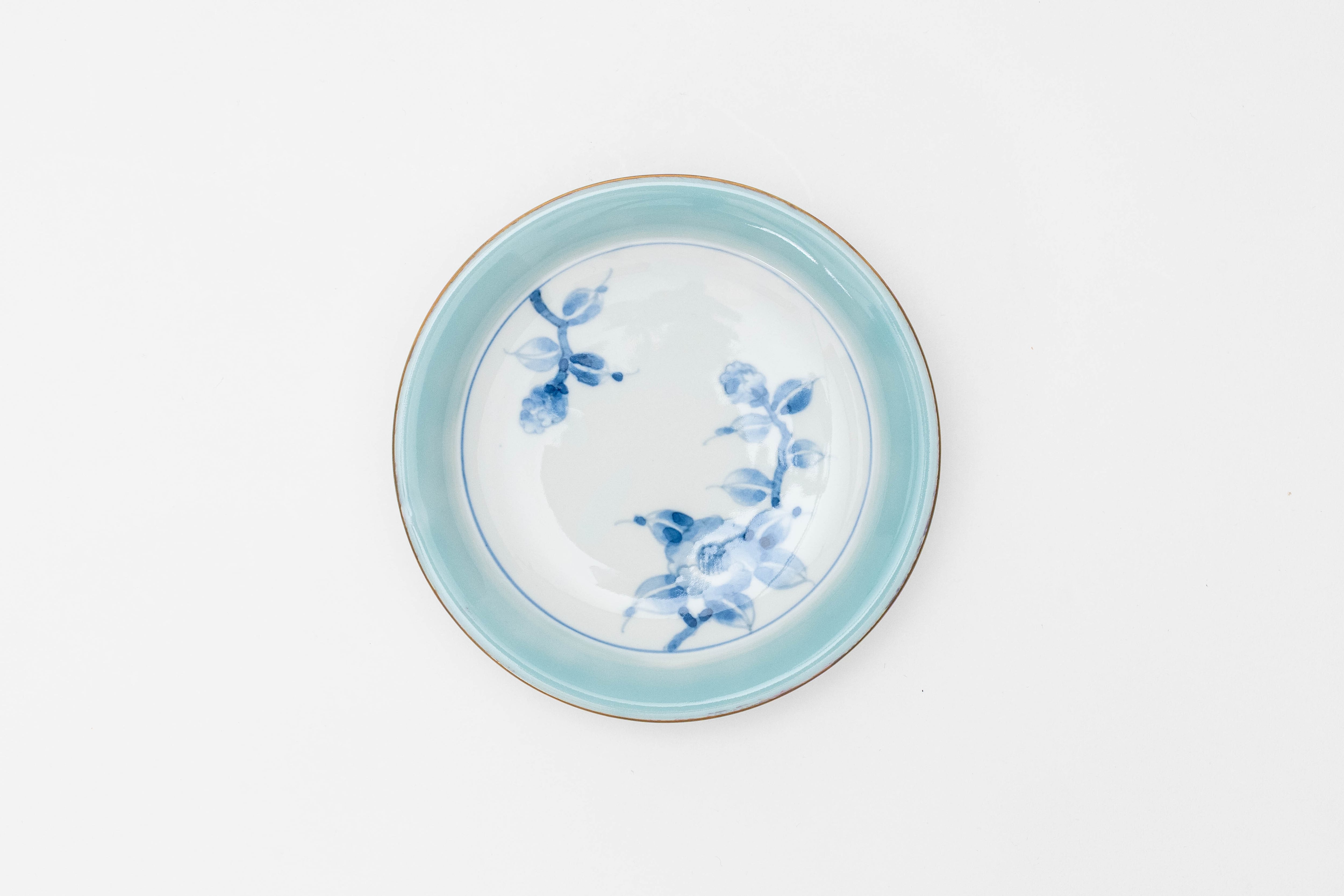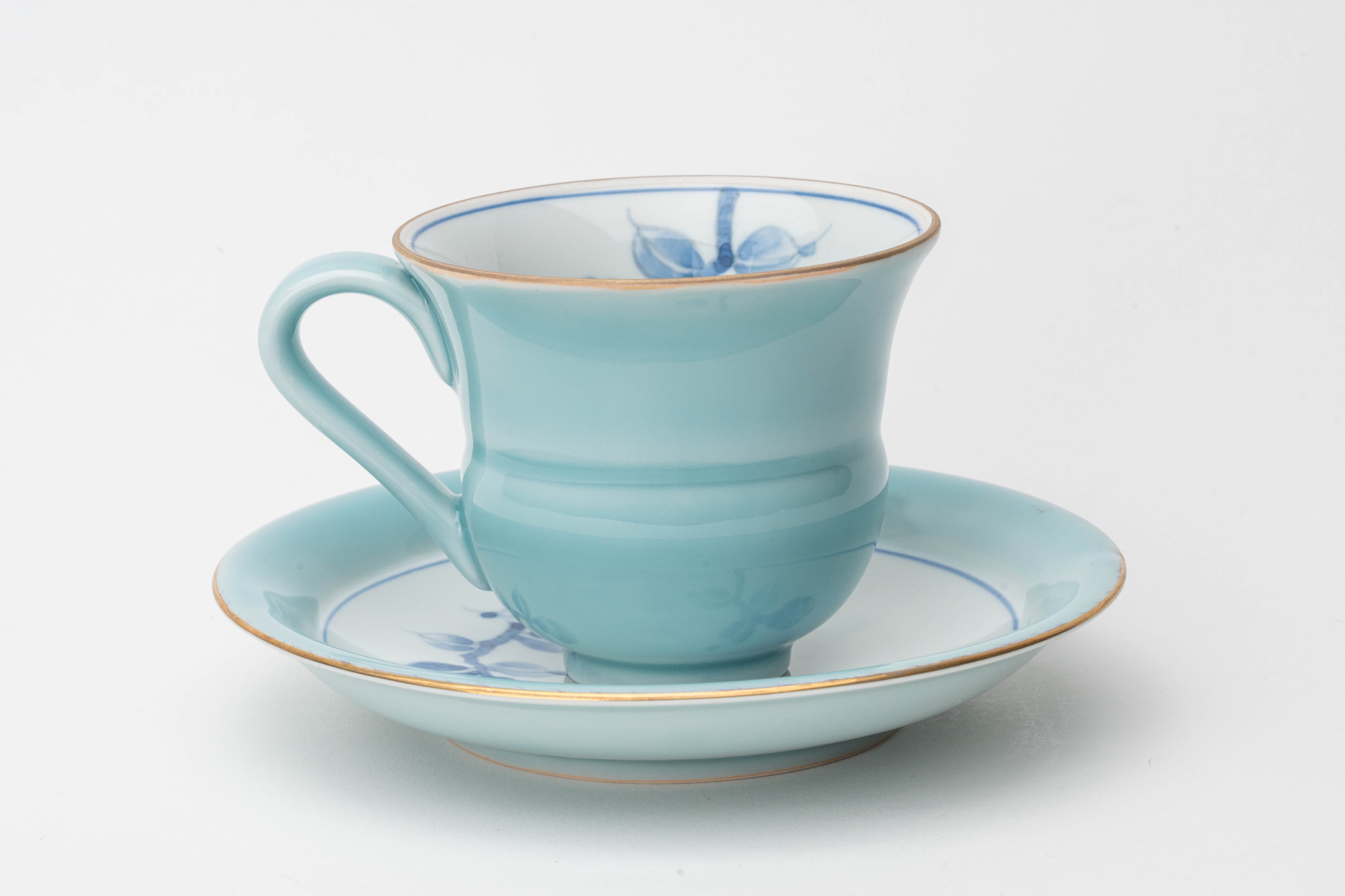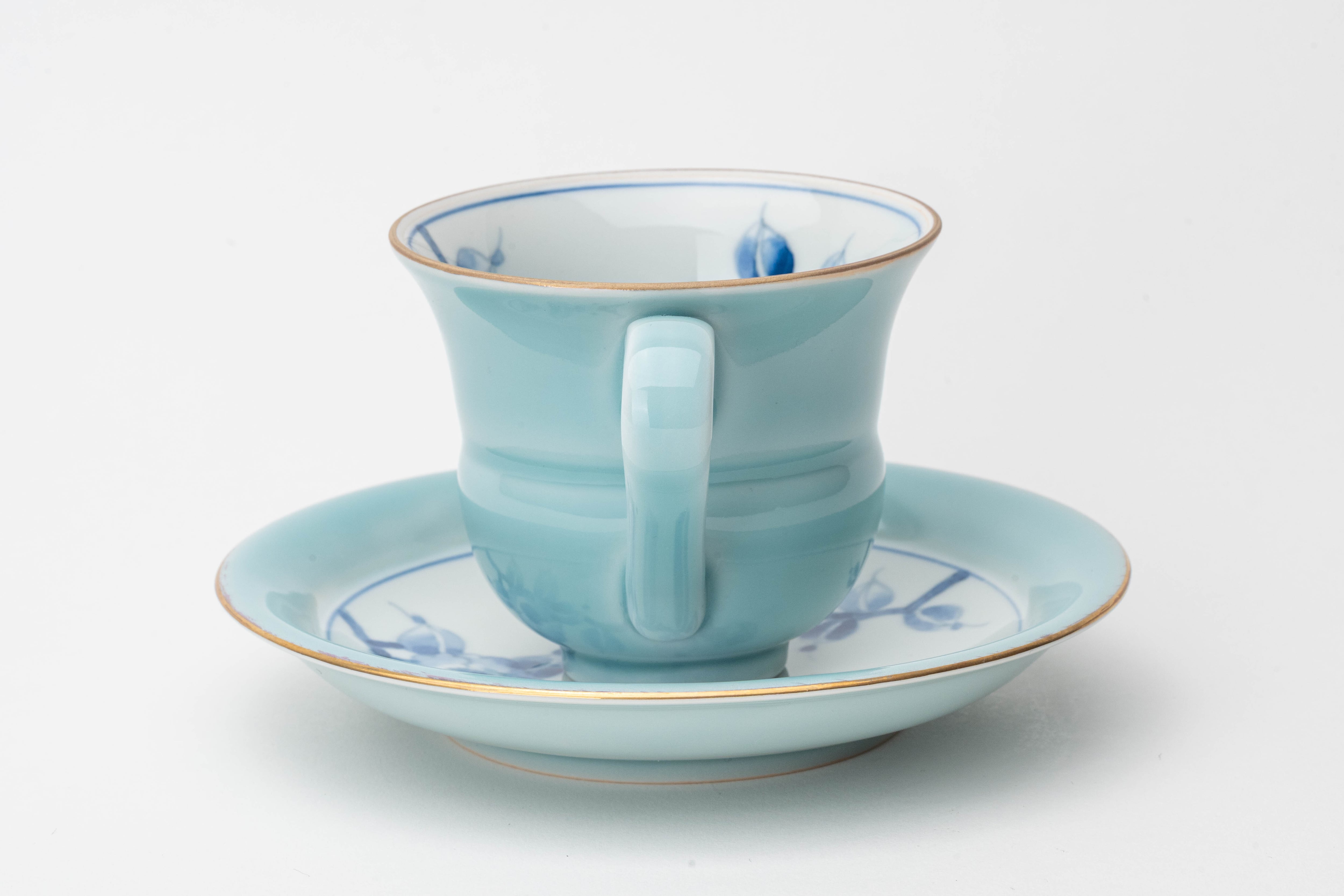 淡い青磁釉の上に、やわらかなタッチで椿(カメリア)を描いた三宅窯のモーニングカップ&ソーサーです。口縁の金彩ラインがさりげない品格を添え、毎朝のコーヒータイムを特別な時間に変えてくれます。