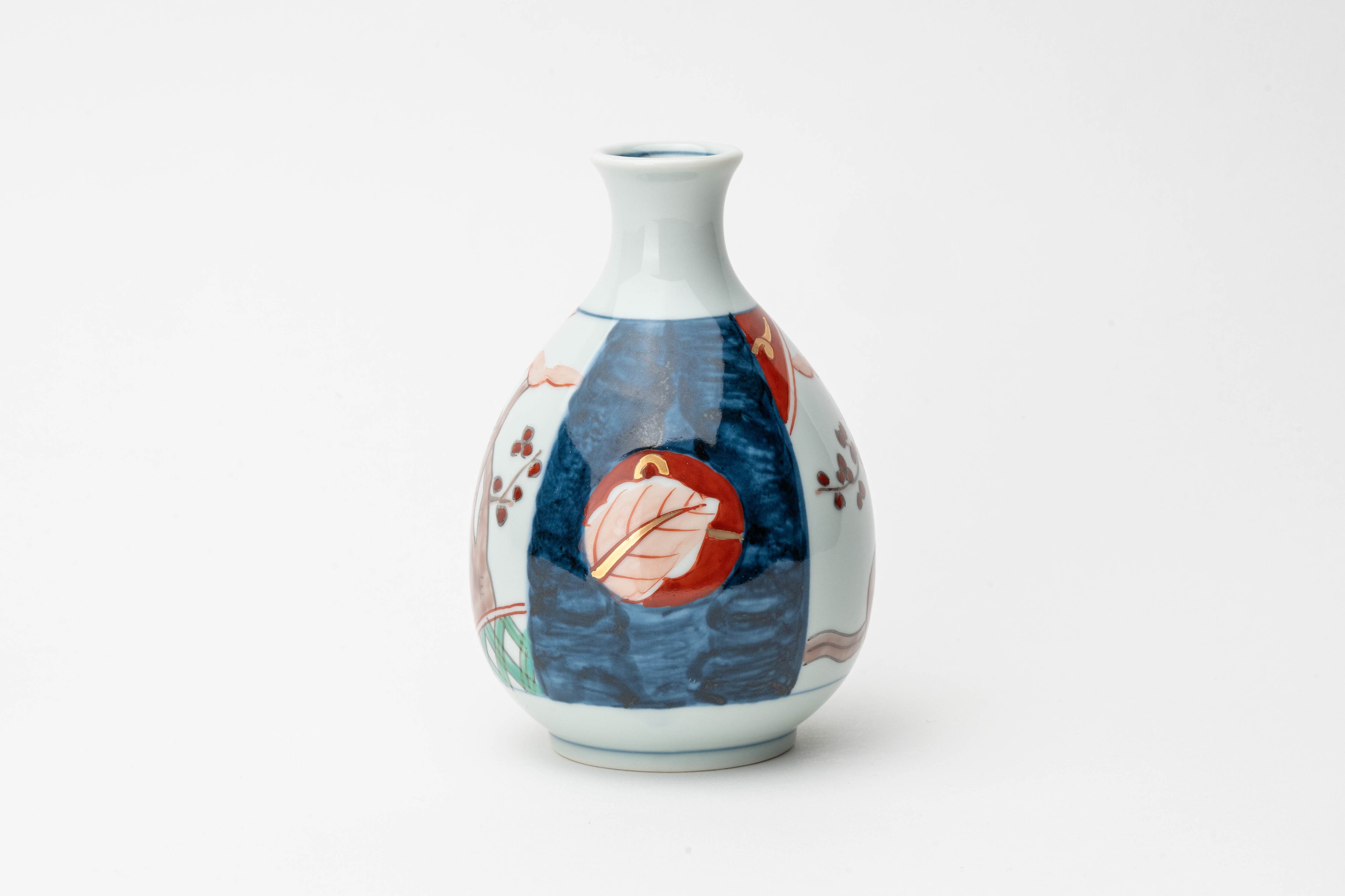 梅の枝と赤・藍の染錦パネルが美しい古伊万里文様を、ころんと丸いフォルムに描いた三宅窯の徳利です。藍の濃淡と赤絵の華やかさが調和し、食卓に伝統の風格を添えます。同シリーズの角湯燗徳利(57番)や盃(58・59番)と組み合わせて、古伊万里の酒器セットとしてもお楽しみいただけます。